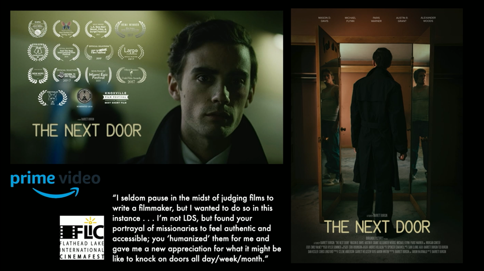 My short film The Next Door is a psychological thriller about missionaries. It’s not uplifting or preachy, just focusing on missionaries and their investigator who goes missing. They embark on a journey to figure out where he’s at, framed as a noir detective movie. The film is currently on Prime Video.