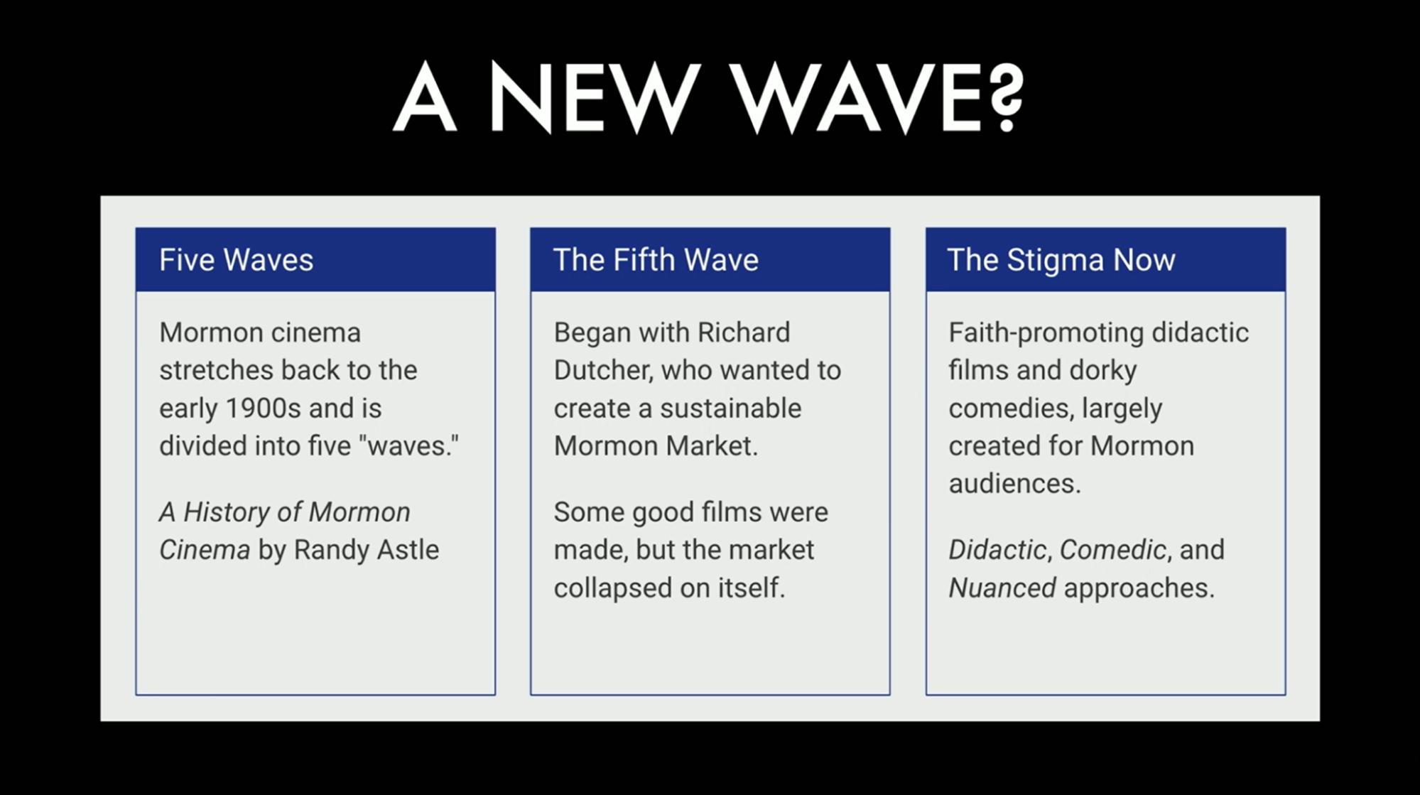 To give you a brief summary, what has been termed Mormon Cinema, I now call Latter-day Saint Cinema out of respect for proper terminology. Mormon Cinema stretches back to the early 1900s, divided into five waves, as found in A History of Mormon Cinema, an essay part of the BYU Studies book about Latter-day Saints and film.