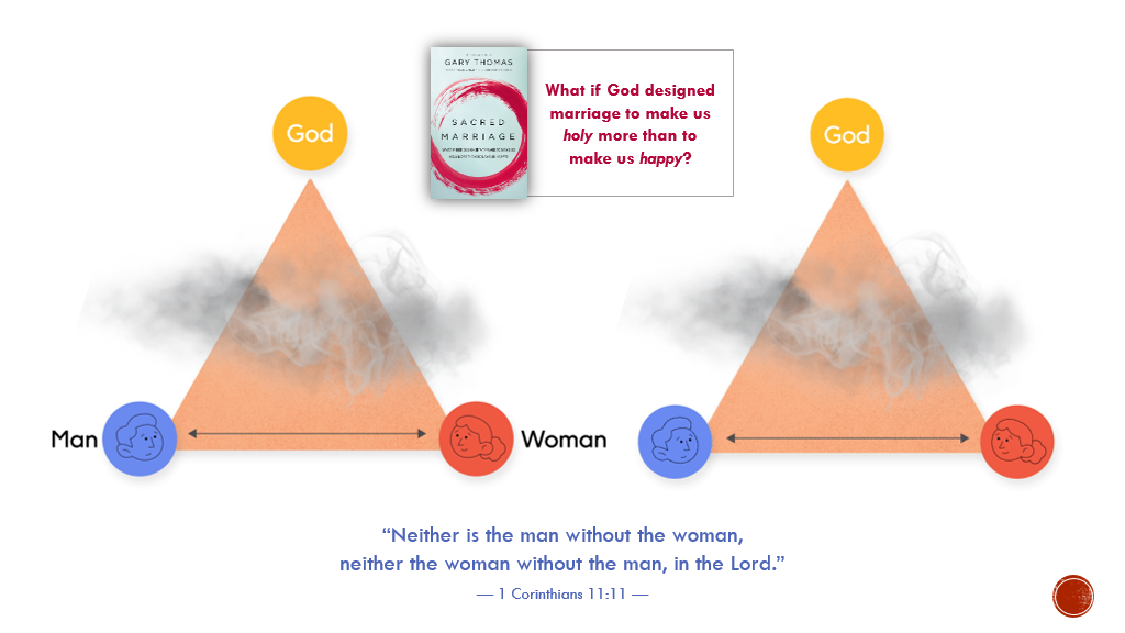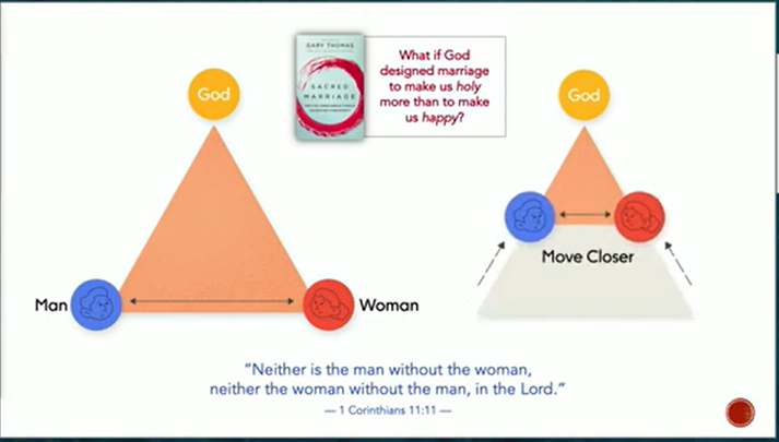I want to start with an analogy or metaphor: the triangle of the covenant marriage. As we come into marriage, we are cleaving together in our covenant with God, involving three participants. Moving closer to God and nurturing ourselves spiritually brings us closer together. The oneness we seek can only come together in Christ.