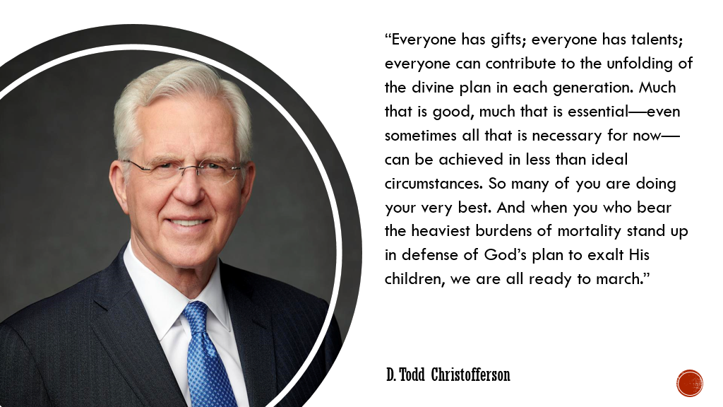 Everyone has gifts. Everyone has talents. Everyone can contribute to the unfolding of the divine plan in each generation. Much that is good, much that is essential, even sometimes all that is necessary for now, can be achieved in less ideal circumstances. So many of you are doing your very best, and when you who bear the heaviest burdens of mortality stand up in defense of God’s plan to exalt His children, we are all ready to march.”