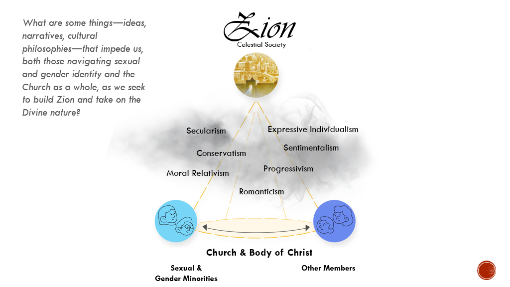 With all of this framing in mind, there’s a critical question I’d like to consider with you: What are some of the ideas, narratives, and cultural philosophies that impede us—both those navigating sexual and gender identity, and the church as a whole—as we seek to build Zion and take on the divine nature? These are kind of like the air we breathe or the water we swim in—they impact us every day. I’ll talk more about these as we go, but I want us to think about this.