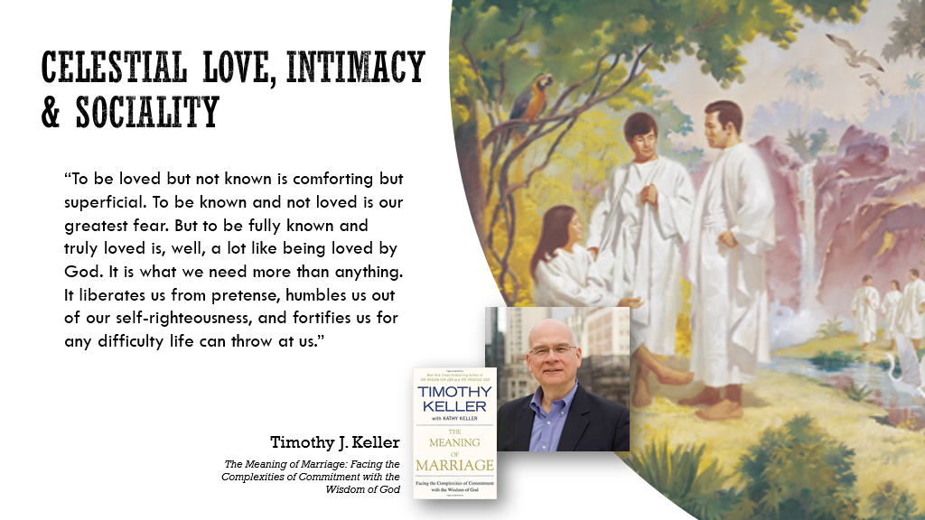 Some principles: we know God is a being whose defining essence is love and who is the literal embodiment of the fullness of light and truth. Furthermore, in Joseph Smith’s vision of the Kingdoms of Glory recorded in D&C 76, he saw in the celestial glory where we receive of His fullness, we have a quality of relationship where we see as we are seen and know as we are known. That is the very essence of the definition of the word intimacy, which we gravely distort when we use that word as a euphemism for sex.