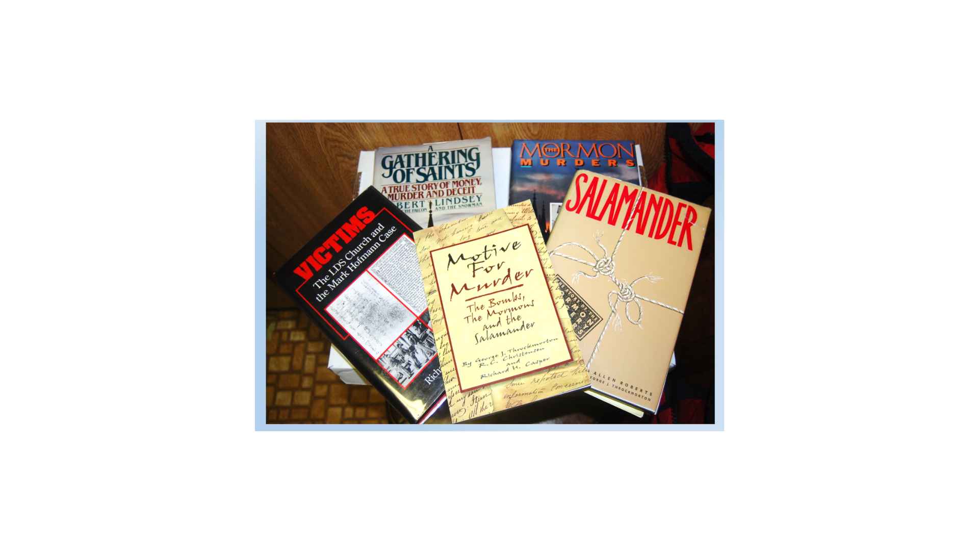 Steve: Oh, the Salamander. Yes, you have these various books, here in the box, he had Mormon Murders, Gathering of Saints, Salamander, and Victims. I shared my news clippings with Alan Roberts and Linda Solito, so I get a little footnote, “thanks for the clippings.” As you saw in that one picture, my library has expanded since that time.