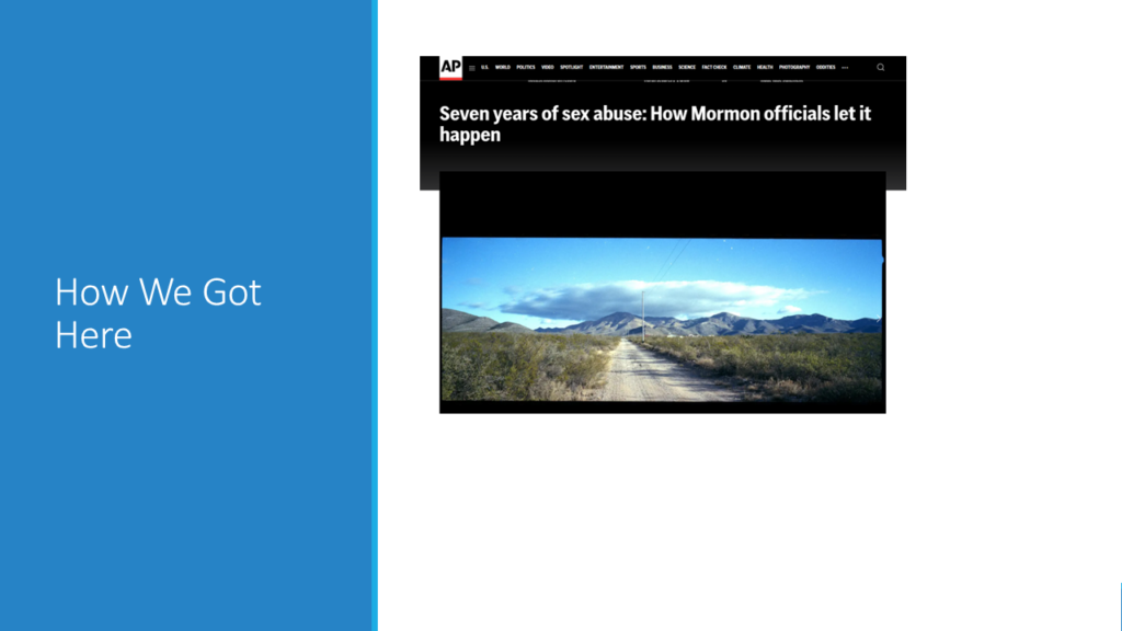 This time last year: you might recognize this picture from this article — on the first day of FAIR (I wasn’t living here in Utah at the time) I woke up in my hotel, did what I always do, which is, I like to check the newspapers. And like many of you, I read a horrific story about an LDS family in Bisbee, Arizona, where the father had abused the children. It is a terrible story. But to be honest, I was on my way to the conference. I had a number of friends and colleagues who were speaking, I was excited to hear them — I didn’t really want to spend the time or the emotional energy reading the story. So, I skimmed it and went on with my day. I arrived here. I sat in that back corner, when Josh Coates of the BH Roberts foundation leaned back in his chair and said, “You’re following this Bisbee Arizona case, right?” I said, “Yeah, I saw it. I skimmed it. I didn’t really read it. It’s a horrific case of abuse.” He says “Yeah, it’s a horrific case of abuse. But it’s also a horrific article. It’s deceitful.”