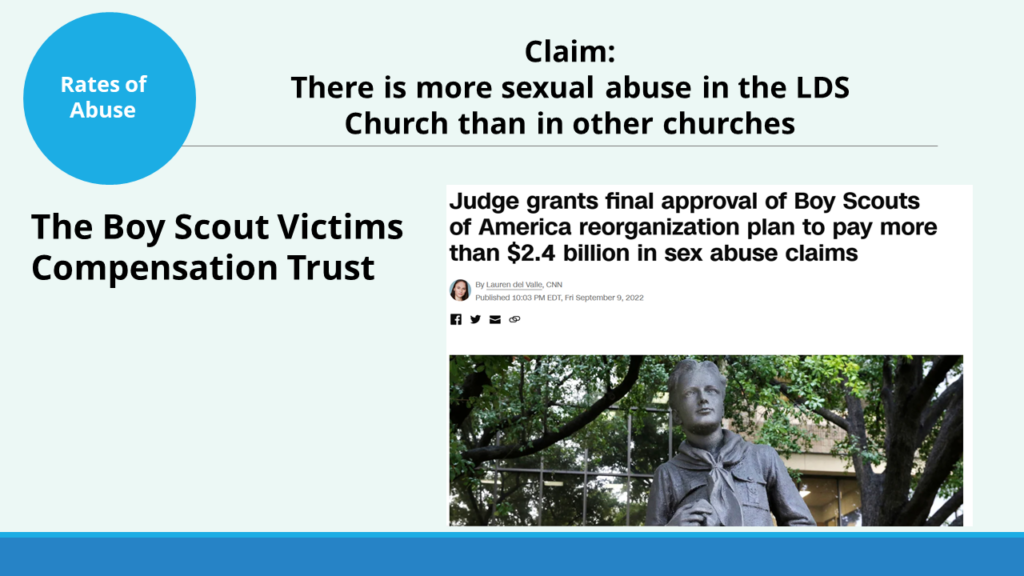 So, the Boy Scouts Victim Compensation Trust: the church paid $250 million into this fund, or 30% of the fund. The question that rises in my mind is: “Huh. How did they come up with that number? How did they come up with that percent? Why 30%?” I mean, it’s an interesting question, right? And you can find claims online where people will say — this is a quote — “They’re getting off for pennies on the dollar. Surely the church is responsible for more than 30% of the abuse that’s happened in the Boy Scouts!”  But is that true? Well, is our Church responsible for 30% of the abuse that happened? So, what can we actually know?
