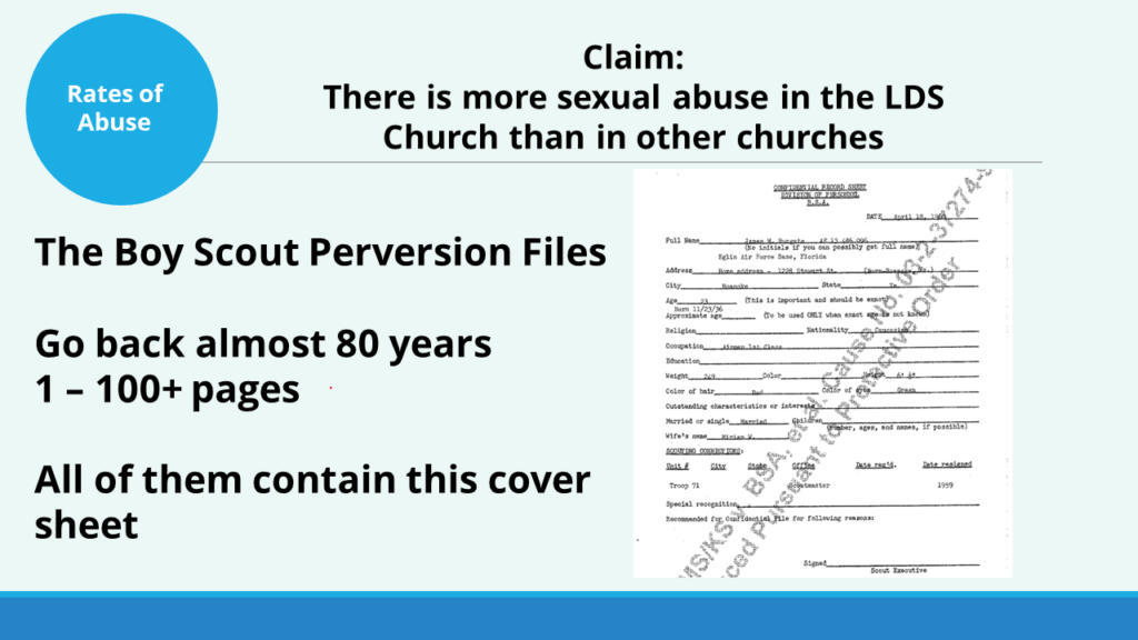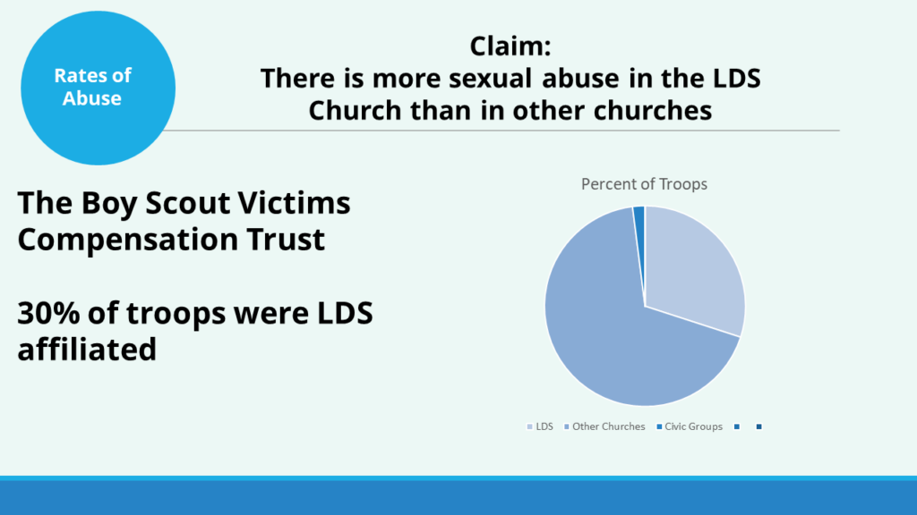 The claim is that there has been more sexual abuse in the LDS church than in other churches. The evidence says there’s actually statistically, provably less abuse — at least in this dataset, At least when we’re looking at these numbers. I don’t know how to get access to other numbers to look at them. If you do, please tell me — but the one dataset that we have access to, it’s significantly less.