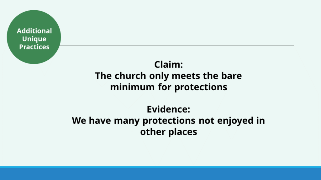 The more interesting question is: are we doing anything that’s above this gold standard, which actually ironically, has sort of become the bare minimum — everybody does those things. All the things on that list? Every church does those, everybody cares about stopping sexual abuse. We’re not something special because we do those things. And, and those things are not what’s driving a number like that 5.16% to be so low, because if they were everybody would be having a low number like that and they don’t — so what are we doing that’s different?