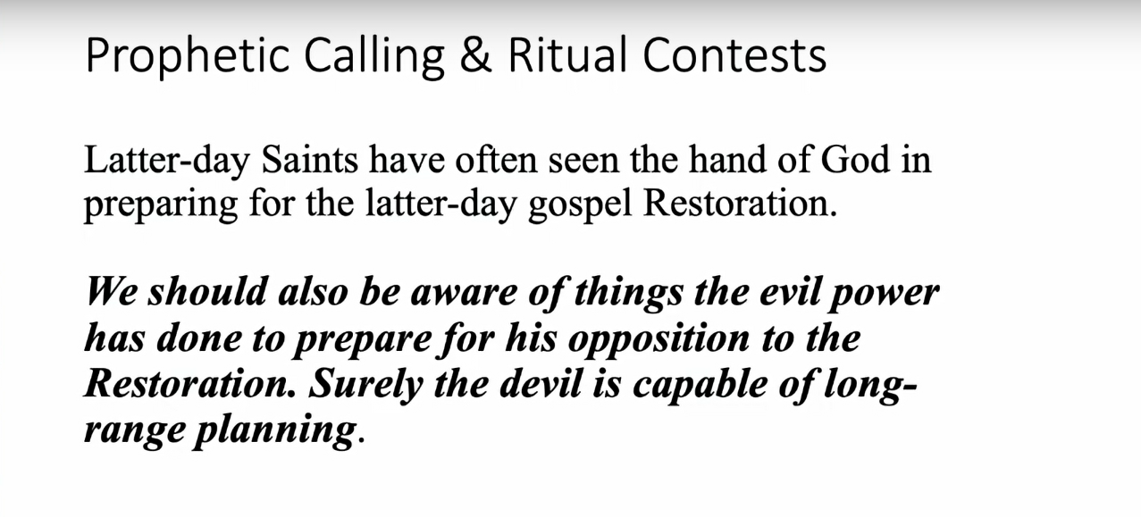 The evil power prepared to oppose restoration of the gospel by setting the stage for ritual (that is, magical) contests to be arrayed against the Prophet to discredit him and the work. It will also be seen that as a prophet of God Joseph beat the Adversary at his own game, so to speak. Latter-day Saints have often seen the hand of God in preparing for the latter-day gospel Restoration. We should also be aware of things the evil power has done to prepare for his opposition to the Restoration. Surely the Devil is capable of long-range planning. Joseph was confronted by such things. Two significant experiences will be considered — his encounter or contest with the ritual of folk magic with its treasure hunting; and the ritual of Freemasonry.