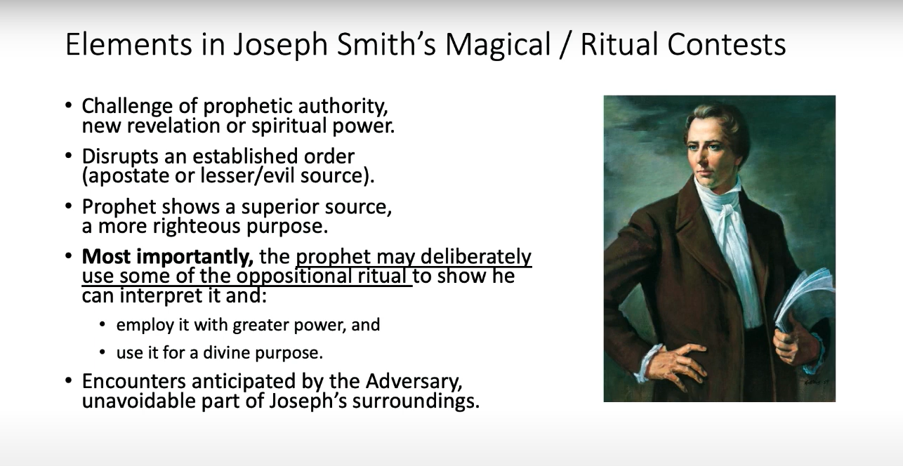 George Mitton: Evidence of Joseph Smith’s prophetic calling can be seen in his encounters with counterfeit authority, and how he won in ritual contests similar to those experienced by biblical prophets. My published essay on this topic, in the festschrift for Daniel Peterson, concerns this type of encounter, and is titled “Joseph Smith and the Magical Contest.”[1] I will briefly discuss some important aspects of that study.