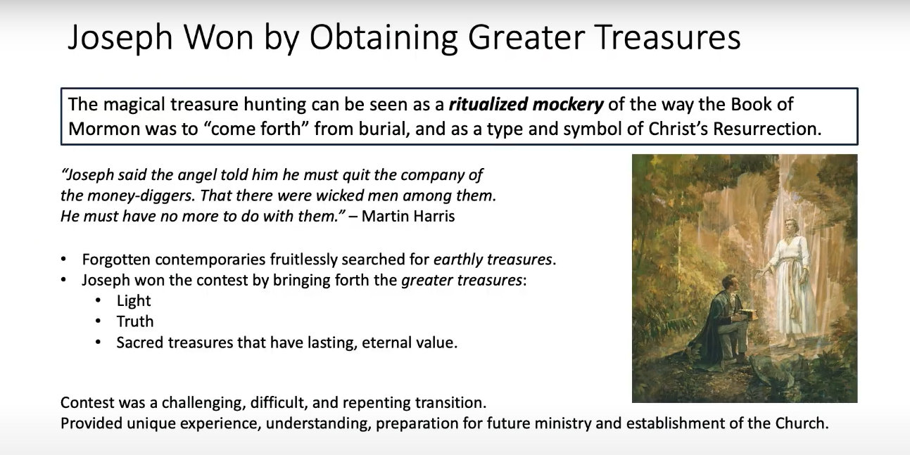 While his now all-but-forgotten contemporaries were fruitlessly searching for earthly treasures, Joseph eventually won that contest by bringing forth the greater treasures: the heavenly treasures of light and truth in the Book of Mormon. Unlike his opponents, Joseph obtained sacred treasures that have lasting, eternal value.