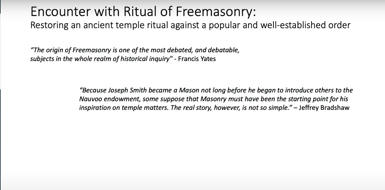 Frances Yates, the noted English historian of the Renaissance, commented that the origin of Freemasonry “is one of the most debated, and debatable, subjects in the whole realm of historical inquiry.”[15] And, as to Joseph Smith’s encounter, Jeffrey Bradshaw observes: “Because Joseph Smith became a Mason not long before he began to introduce others to the Nauvoo endowment, some suppose that Masonry must have been the starting point for his inspiration on temple matters. The real story, however, is not so simple.”[16] Bradshaw has recently published a detailed book discussing Joseph Smith’s temple rites and Freemasonry.[17]