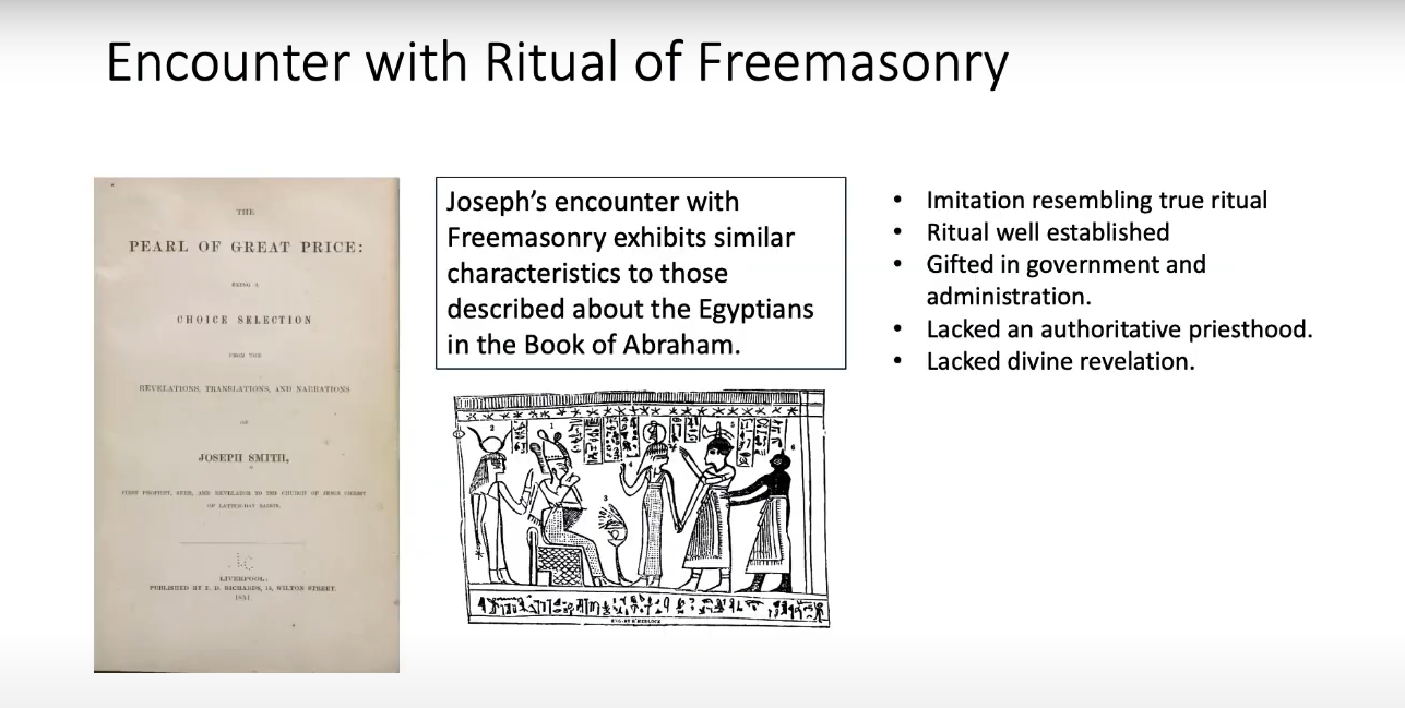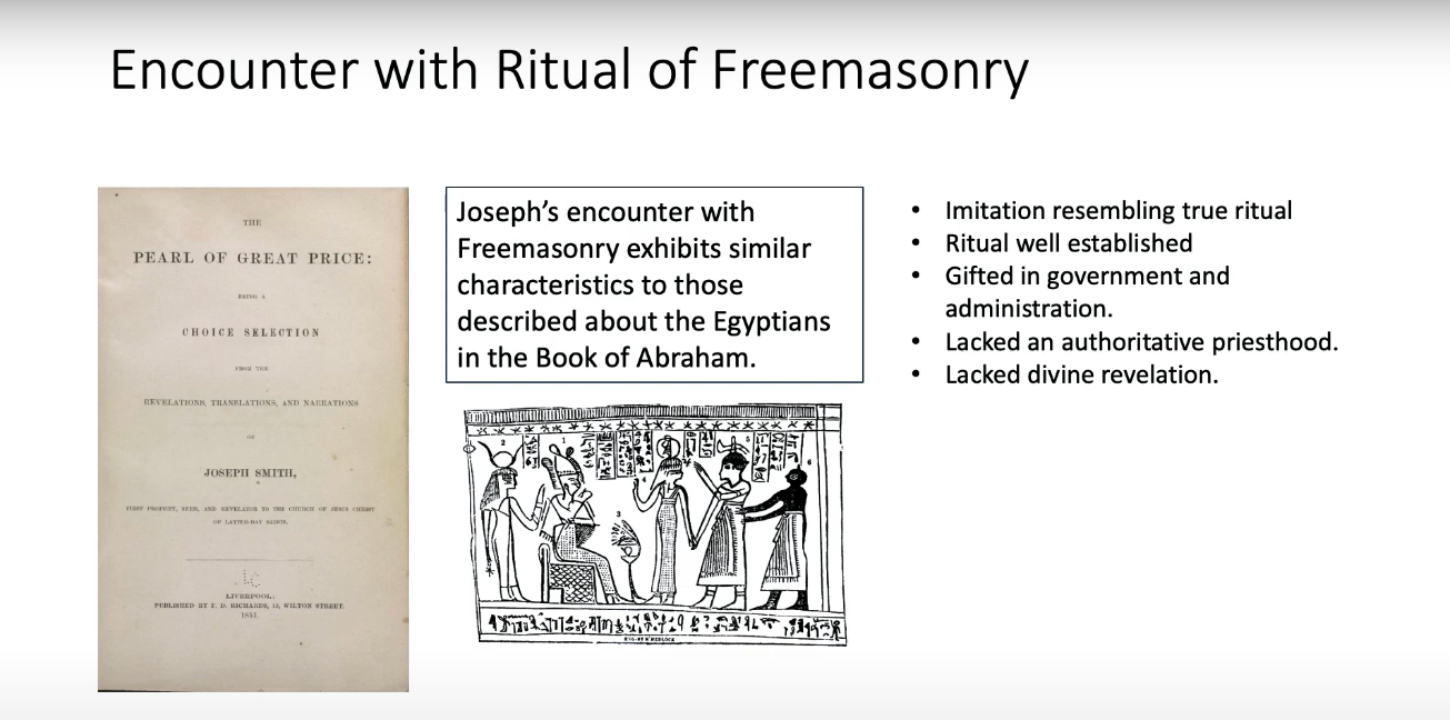 Joseph Smith’s encounter with Freemasonry exhibits some similar characteristics to those described about the Egyptians in the Book of Abraham. He was required to restore an ancient temple ritual against the backdrop of Freemasonry, a popular and well-established order and ritual to which many Latter-day Saints at Nauvoo belonged when Joseph’s revealed temple ceremonies were introduced. He had to establish ordinances that would stand the test of time and be in harmony with information about ancient temples to be discovered in future times.
