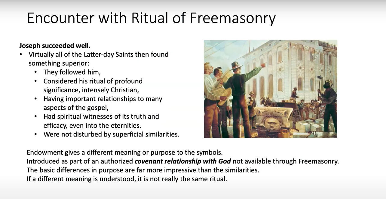 Freemasonry did not provide such rich religious relationships. Indeed, it did not claim to be a religion at all.[22] And while some “Masonic” type symbols appear in both rituals, it is most important to note that the endowment gives a different meaning or purpose to the symbols. In the Latter-day Saint ceremonies, they are introduced as part of an authorized covenant relationship with God not available through Freemasonry. The basic differences of purpose are far more impressive than the similarities. This is most significant, because in ritual the meaning of the symbol is all-important. If a different meaning is understood, it is not really the same ritual.