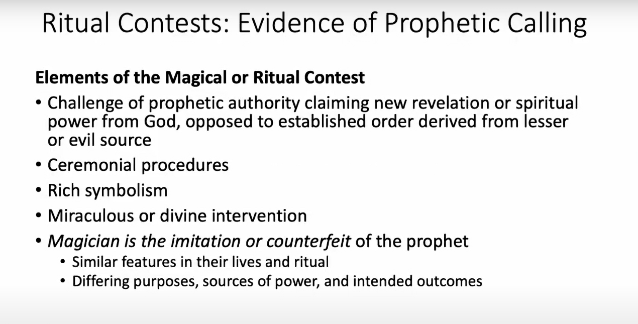 While we have not time to discuss them in detail, it is important to note they are contests of authority and spiritual power. There will be miracles. The contests involve the challenge of prophetic authority claiming new revelation or spiritual power from God, as opposed to an established order which may derive, at least in part, from a lesser or evil source. Both sides may display power, but the prophet shows a superior source and, in the end, a godly purpose.