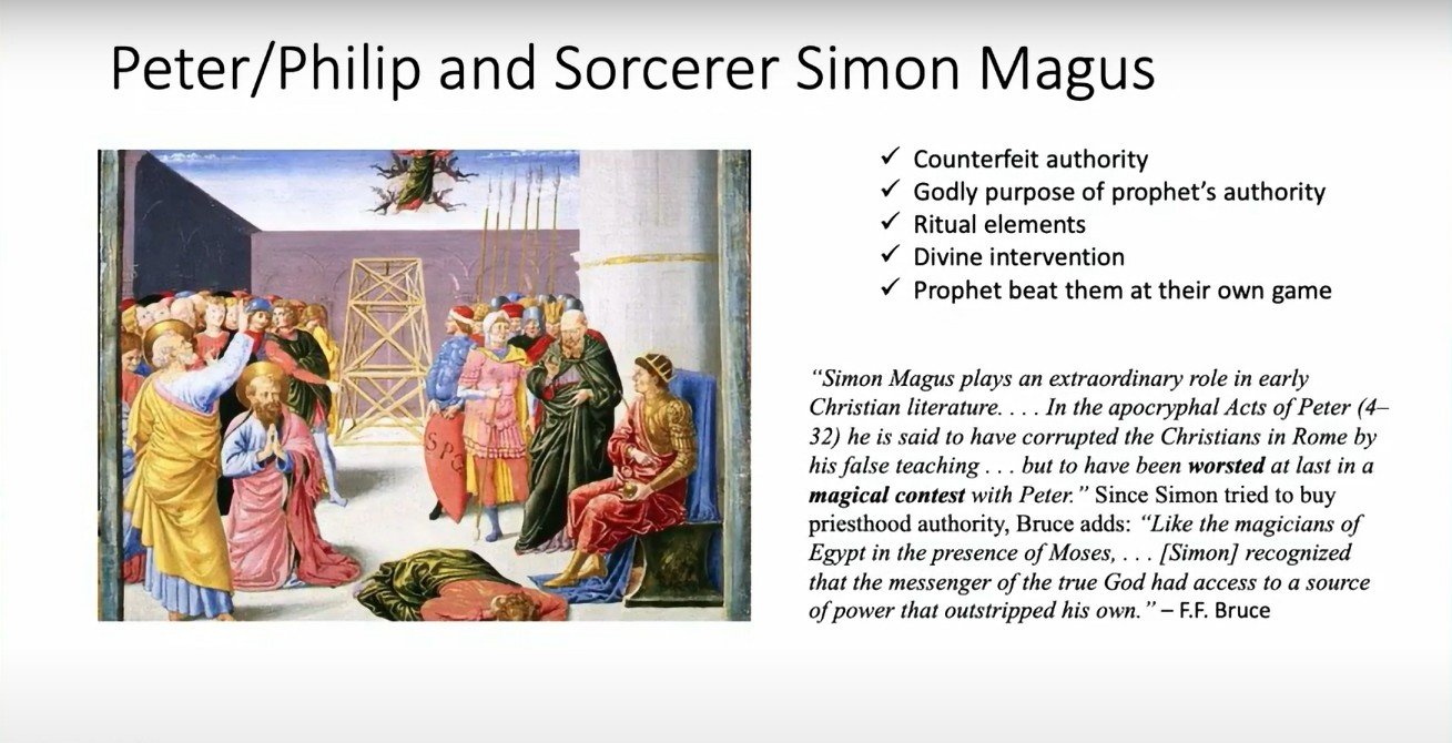 ● Peter and Philip had encounters with sorcerer Simon Magus in the Book of Acts (Acts 8:9–11). F. F. Bruce, noted biblical scholar, observed: “Simon Magus plays an extraordinary role in early Christian literature. . . . In the apocryphal Acts of Peter (4–32) he is said to have corrupted the Christians in Rome by his false teaching . . . but to have been worsted at last in a magical contest with Peter.” Since Simon tried to buy priesthood authority, Bruce adds: “Like the magicians of Egypt in the presence of Moses, . . . [Simon] recognized that the messenger of the true God had access to a source of power that outstripped his own.”[6]