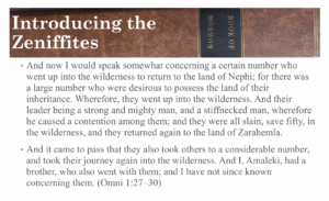 What Mormon does next is interesting. Mormon tells the “real time” story up to a point, and then stops. He abruptly shifts the timeline to the past by inserting Zeniff’s record (Mosiah VI (9–10). Zeniff is the one who led the party to the land of Nephi. He is the grandfather of King Limhi with whom Ammon had been conversing. Thus, Mormon begins to tell a parallel story that took place in a different land and at an earlier time by inserting a record of that people. That story follows the Zeniffite timeline until the people of Limhi and Alma both return to Zarahemla. There the large plate timeline picks up the story at the end of Mosiah 24, which is the end of the inserted record of Alma1.[15]