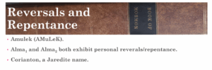 Mormon used a Jaredite name to signal the thematic antithetical parallel embodied in one of Alma2’s sons. When Mormon wrote about Alma2 giving a final blessing to his sons, he spent time on Helaman but gave a similar blessing to Shiblon. Mormon’s version of the blessing spends the most time with the third son, Corianton. Corianton is a Jaredite name. By using that name, Mormon primed his readers for the story of an apostate. Indeed, we get that story. However, we often miss that Corianton reverses that apostasy and becomes a stalwart missionary.[25] Hence, Corianton becomes an example of an antithetical parallel of the expectation of the name.