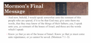 The second purpose was to “show unto the remnant of the House of Israel what great things the Lord had done for their fathers.” That showing consisted of demonstrating repentance to return to the covenant. The covenant had not changed and remained (and remains) available to all who would repent and return to it. That hope underlay Mormon’s final message, directed to future Lamanites: