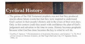 When Mormon showed that Jesus is the Christ, he could do so with fulfilled prophecy. His message for his future audience required a different method. The phrase “what great things the Lord hath done for their fathers” hints at how Mormon intended to show his purpose for the remnant of the House of Israel. When Mormon wrote to show that Jesus is the Christ, it is clear why we think that was important. However, why would it be interesting to know that God had done great things in the distant past? The only way that showing “what great things the Lord hath done for their fathers” could have any impact at all for a future audience came from a cyclical worldview. What the Lord had done is evidence for what he will do.