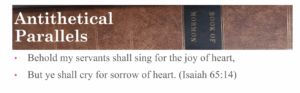 Thus, a simple repetition is that the same thing occurs, hence a synonymous parallel. However, the expectation of the repetition highlights when the parallels intentionally reverse expectations. Parry notes that an “Antithetical parallelism generally consists of two lines and is characterized by an opposition or contrast of thoughts (that is, an antithesis) between two lines.”[8] As an example, he lists Isaiah 65:14.