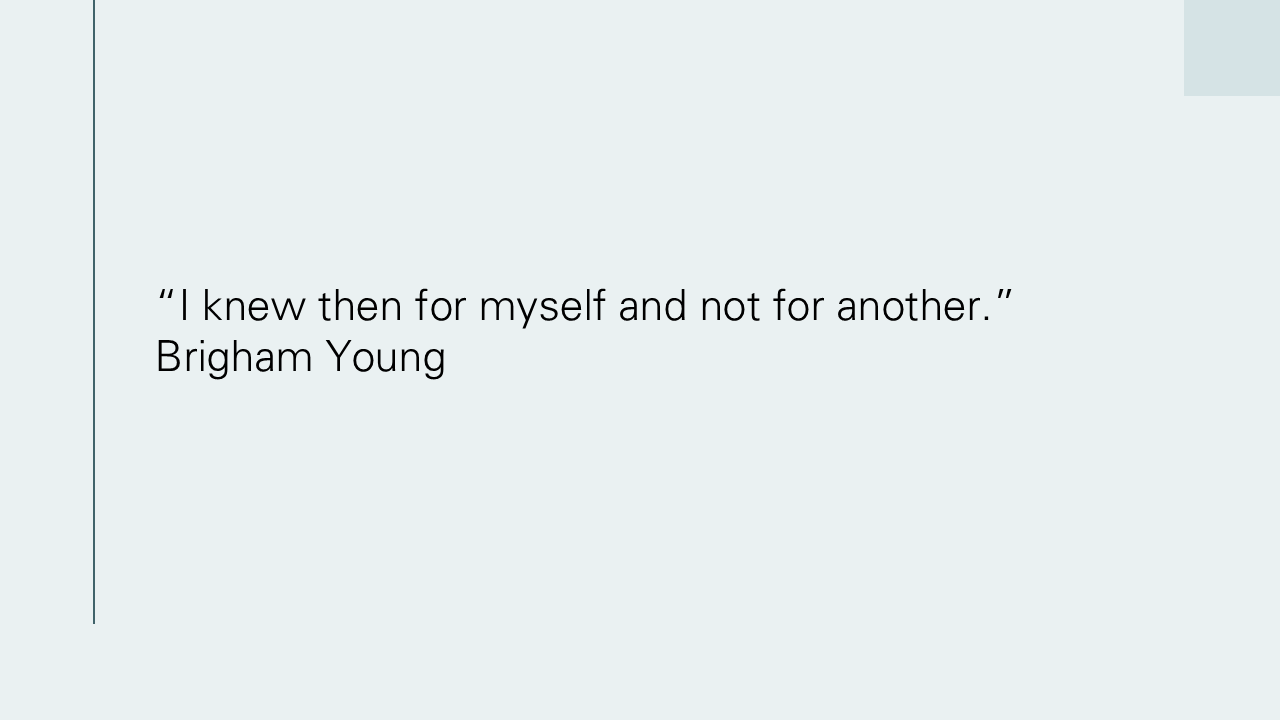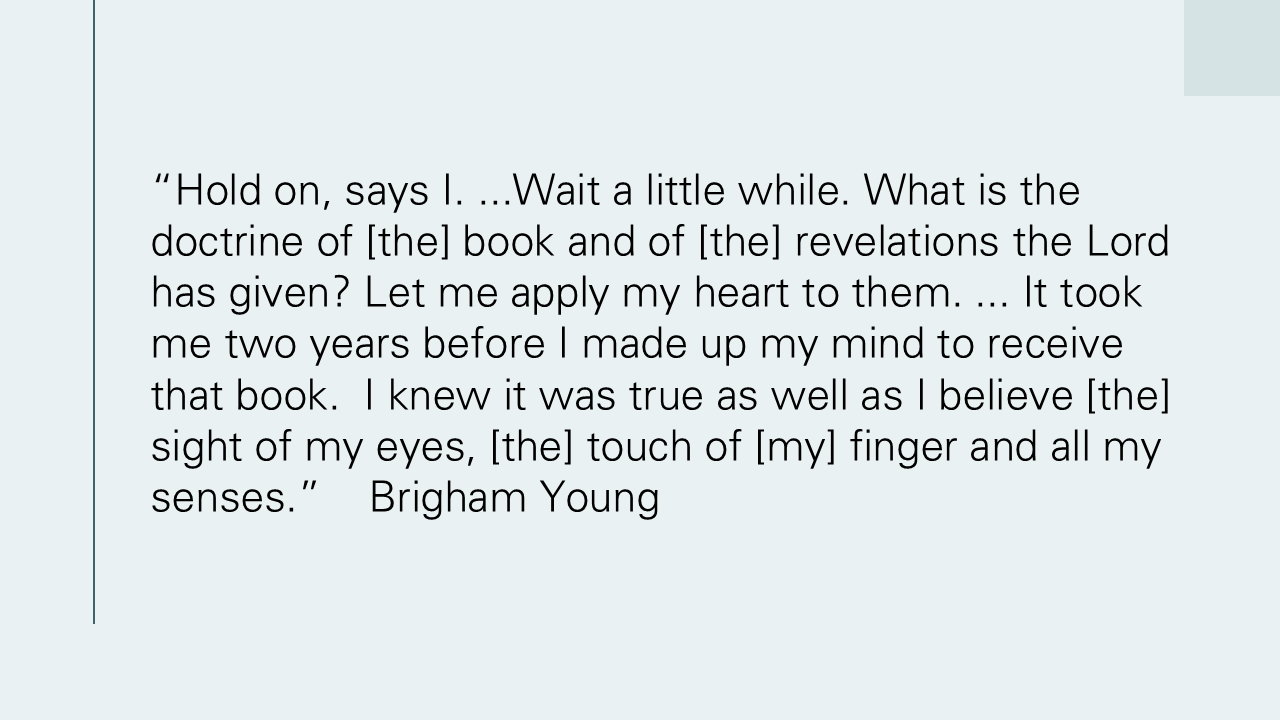 Hold on, says I. … Wait a little while. What is the doctrine of [the] book and of [the] revelations the Lord has given? Let me apply my heart to them. And after [I have] done this, [it is] my right to know for myself. … It took me two years before I made up my mind to receive that book. I knew it was true as well as I believe sight of my eyes, [the] touch of [my] finger, and all my senses.”