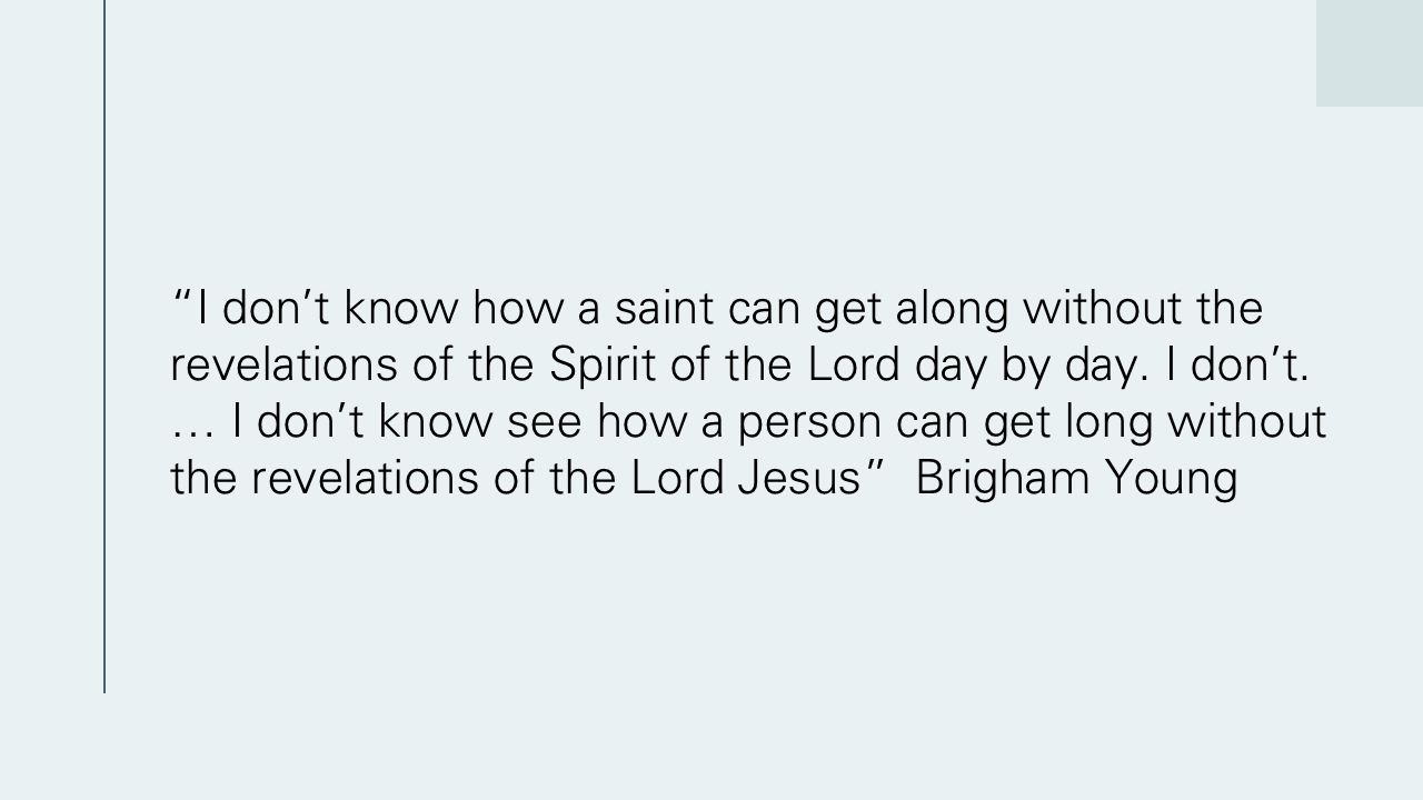 I don’t know how a saint can get along without the revelations of the Spirit of the Lord day by day. I don’t. I cannot accomplish any business transactions and know how to conduct myself before my family, before my neighbors, and do my work, to be prepared to accomplish the work here upon the earth that is assigned me to do manfully, nobly and acceptably to God…