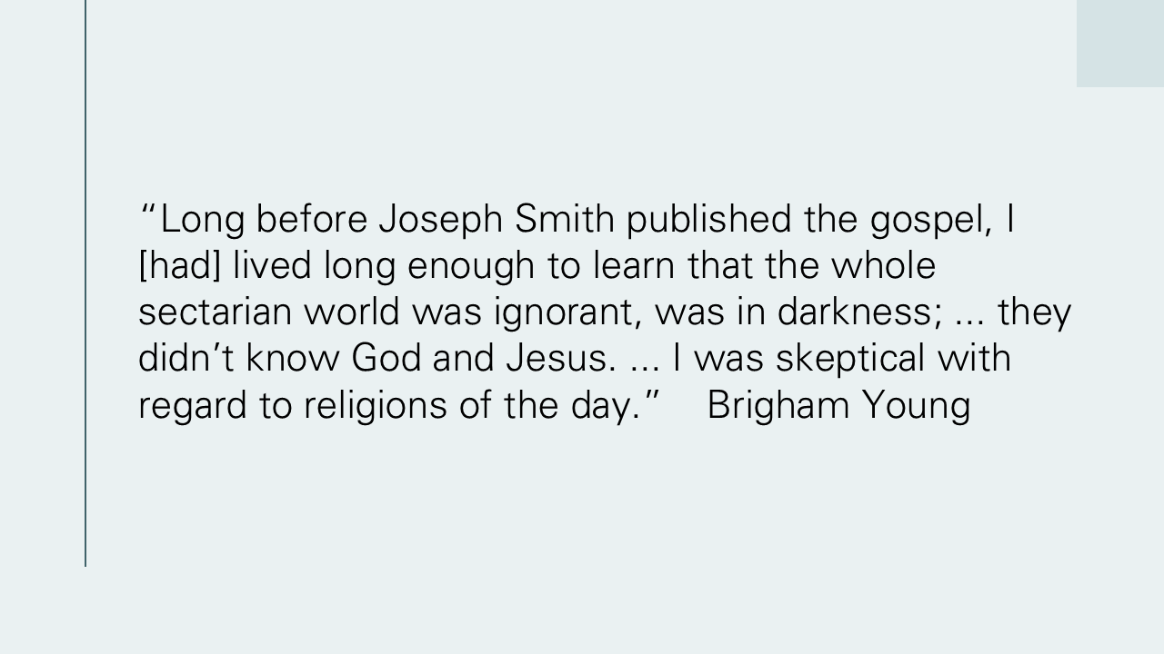 Long before Joseph Smith published the gospel, I [had] lived long enough to learn that the whole sectarian world was ignorant, was in darkness <if> they were not in unbelief, but [I] supposed they were. They were in ignorance; they didn’t know God and Jesus. … I was skeptical with regard to religions of the day.”