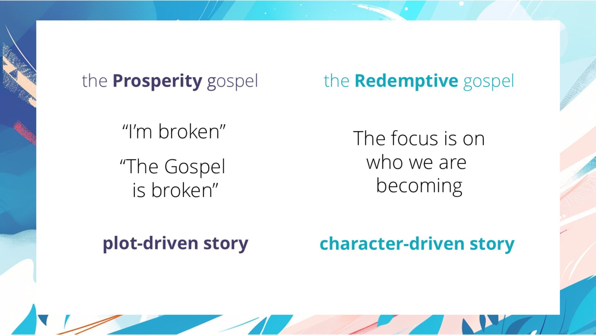 Rather, they were converted to a very subtle distortion or counterfeit of it—versions of the Prosperity Gospel, the Expressive Gospel, or the Therapeutic Gospel wearing the garb and speaking the language of the Redemptive Gospel.