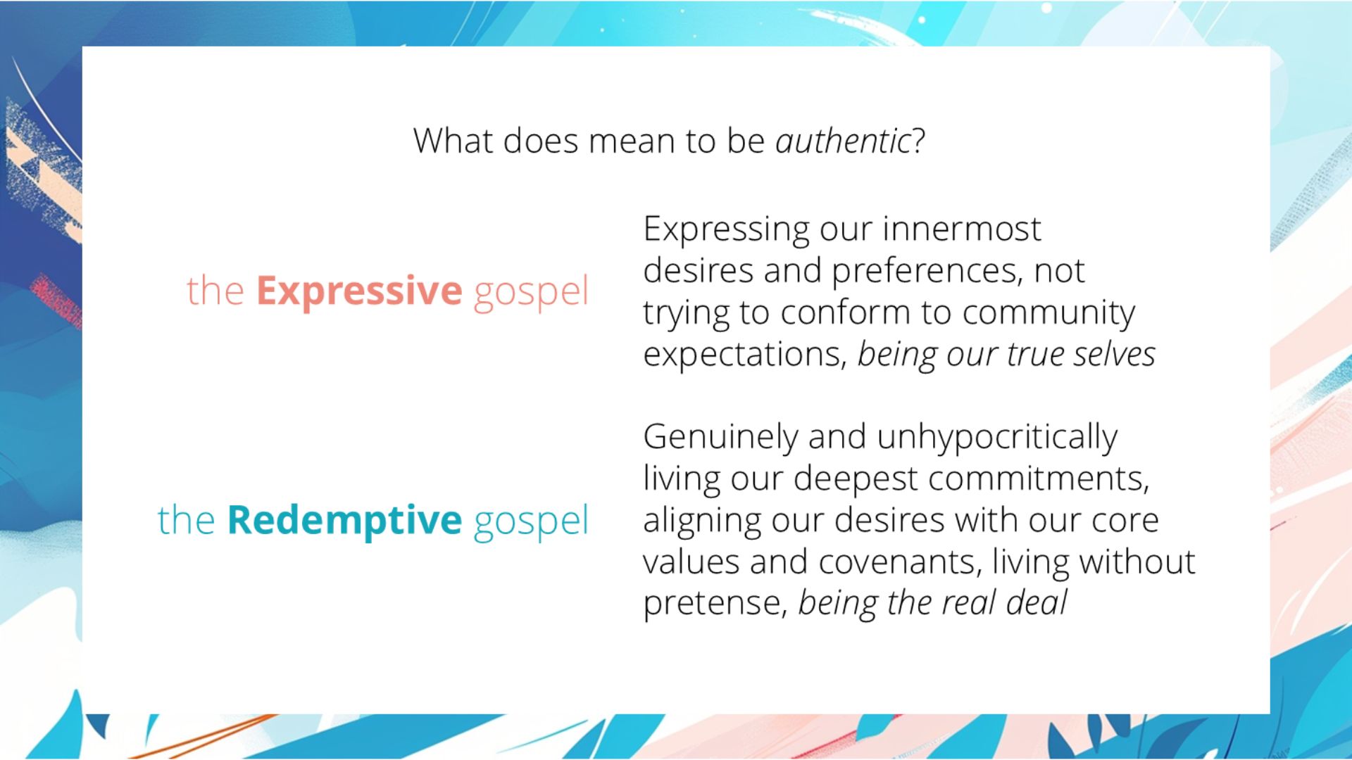 Similarly, authenticity in the Redemptive Gospel means “becoming Christlike and genuine”, whereas in the Expressive Gospel, it means “asserting one’s unique desires over moral teachings.”