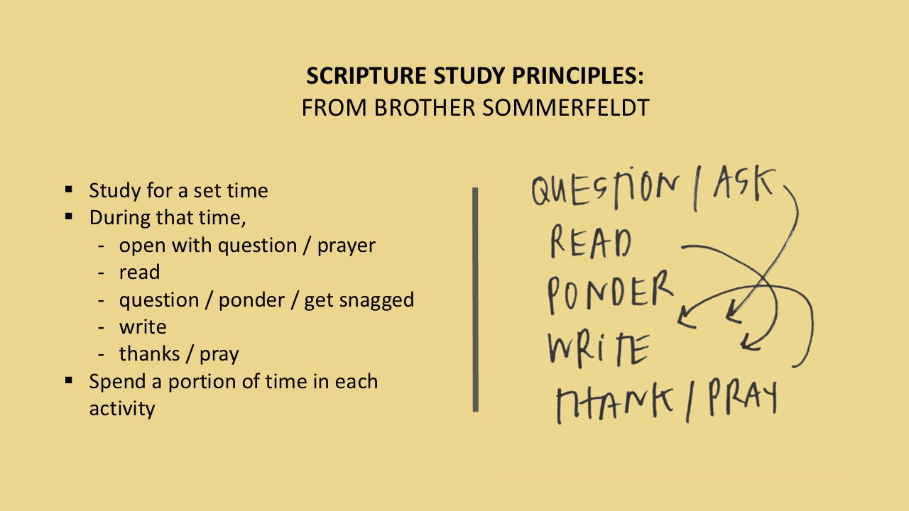 This is an approach of scripture that I learned secondhand from somebody at BYU. I never took the class, but Brother Sommerfeldt was a professor that taught about scripture study, and this was his approach.