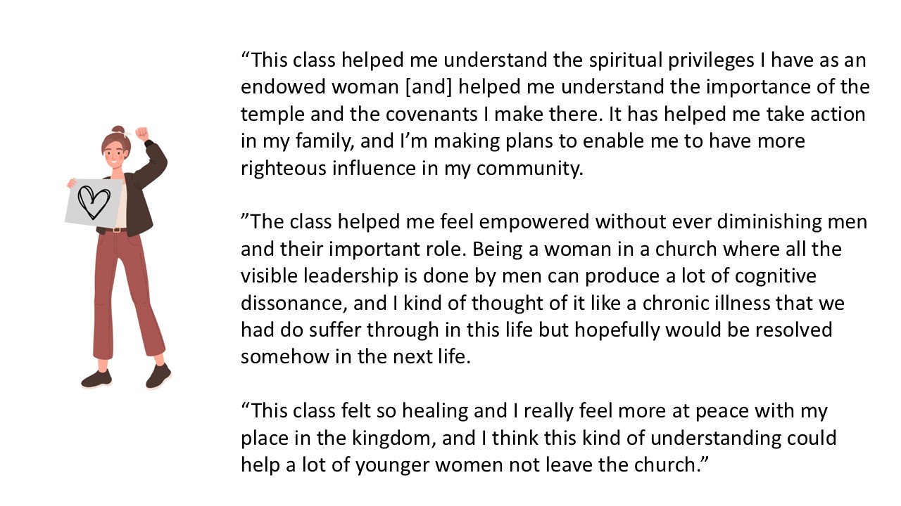 This class felt so healing, and I really feel more at peace with my place in the kingdom, and I think this kind of understanding could help a lot of younger women not leave the Church.