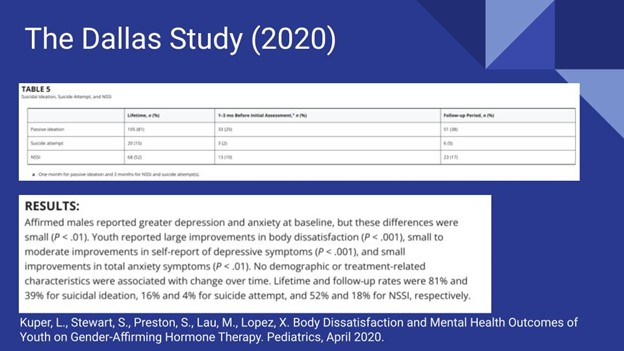 The Dallas study, published in 2020, evaluated 148 adolescents receiving cross-sex hormones at a clinic in Dallas. It claims to provide “further evidence of the critical role of gender-affirming hormone therapy in reducing body dissatisfaction,” as well as “modest initial improvements in mental health.” I give the authors some credit for including that term “modest,” because they reported their results rather strangely and they do not show significant benefit to the kids’ mental health.