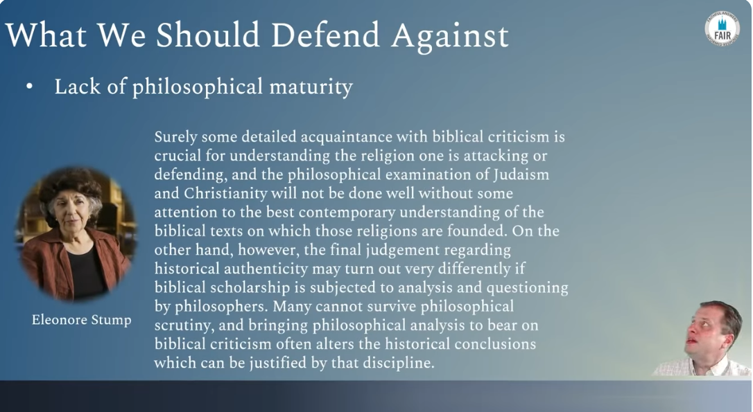 Philosopher Eleanor Stump spoke of this problem, the lack of philosophical maturity in the field of biblical studies.