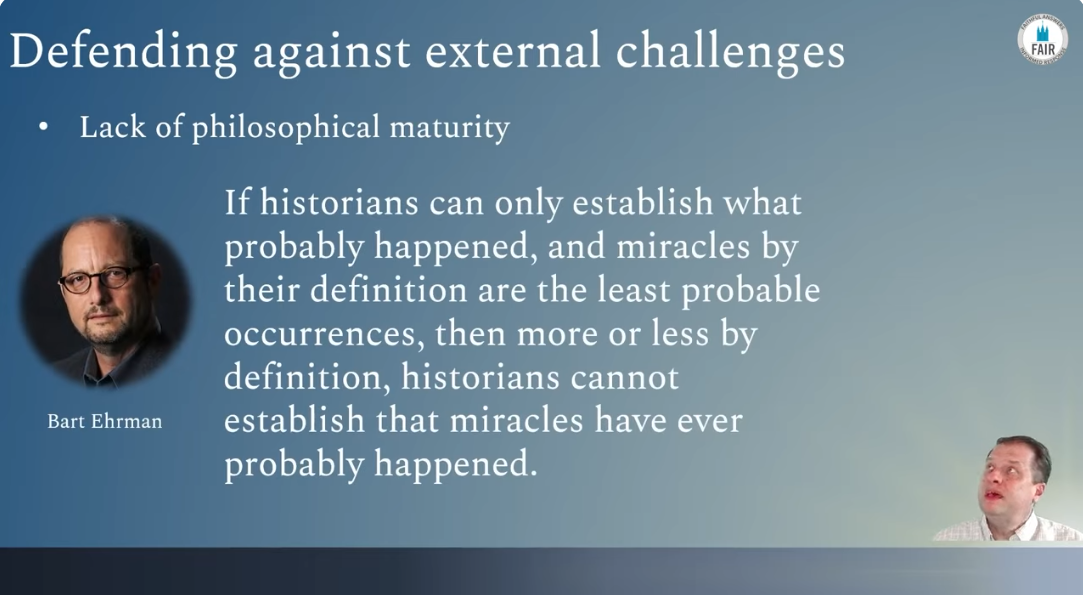 If historians can only establish what probably happened, and miracles by their definition are the least probable occurrences, then more or less by definition, historians cannot establish that miracles have ever probably happened.