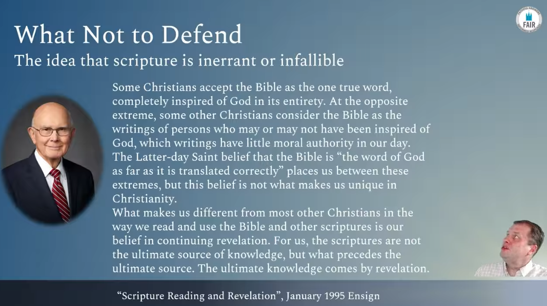 President Oaks referred to extreme views of inerrancy versus skepticism, and we are under no obligation to defend either of those extremes. We can revere the Bible as a sacred offering that has been ordained of God to reveal God’s purposes for humanity without allowing the human processes of production, transmission, and translation to diminish the value of that offering.