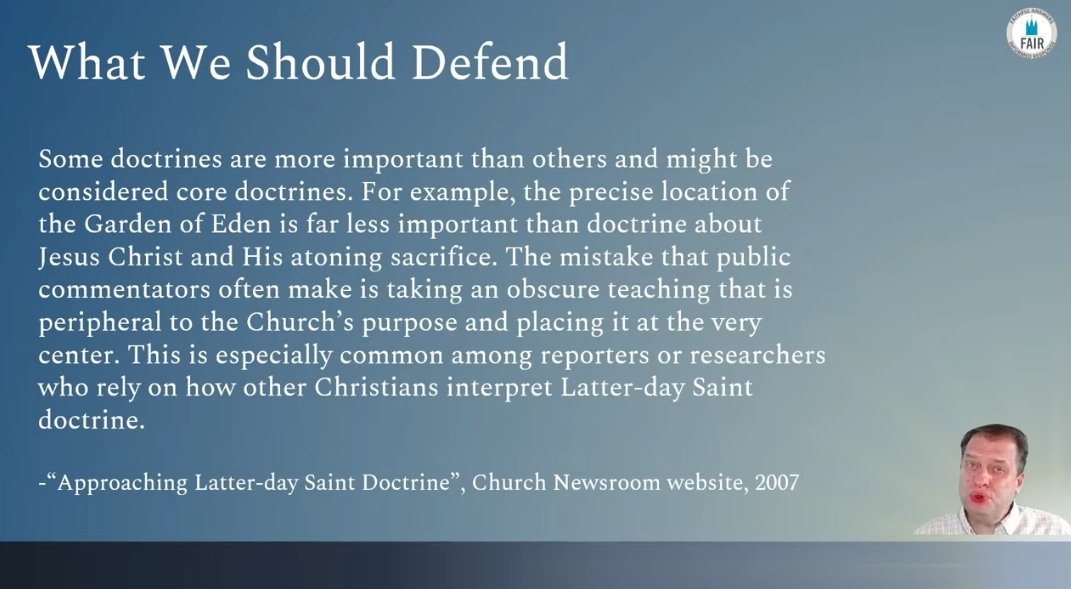 Some doctrines are more important than others and might be considered core doctrines. For example, the precise location of the Garden of Eden is far less important than doctrine about Jesus Christ and his atoning sacrifice. The mistake that public commentators often make is taking an obscure teaching that is peripheral to the Church’s purpose and placing it at the very center. This is especially common among reporters or researchers who rely on how other Christians interpret Latter-day Saint doctrine.