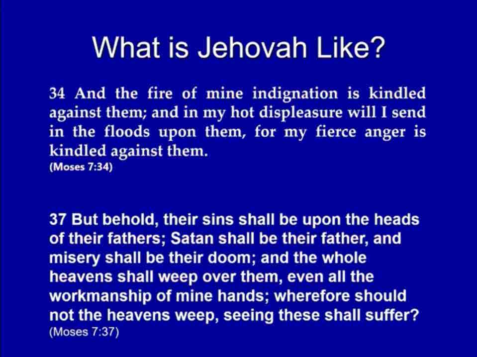 That’s pretty wrathy, right? That’s about as wrathy as it gets. This is an upset God. Now, we we’re going to come back to the idea of an angry or an upset God. But part of the way we can understand that is by reading just a few verses later where he says, “But behold, there meaning the people in those day, their sins shall be upon the heads of their fathers. Satan shall be their father, and misery shall be their doom, and the whole heaven shall weep over them, even all the workmanship of mine hands. Wherefore should not the heavens weep, seeing thee shall suffer?”