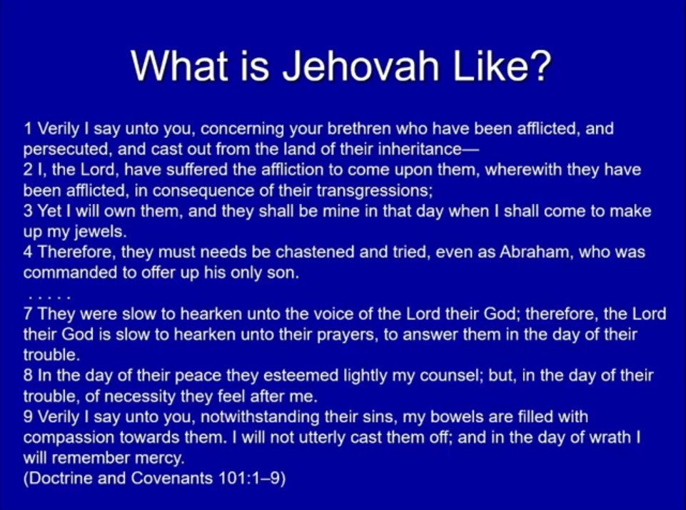 And that’s one of the things that we need to stop and think about: Who is Jehovah really? This is Christ, whose primary job is to reveal the Father to us — either by eventually bringing us into the Father’s presence, but in the interim (and this is what he talks about more than anything else in the Gospels, especially in the book of John) — that he reveals the Father to us by doing what the Father would do, saying what the Father would say, acting the way the Father would act, and so on.