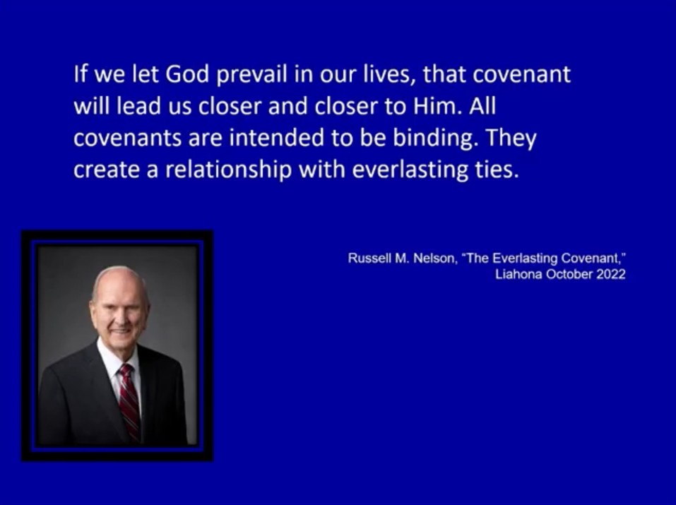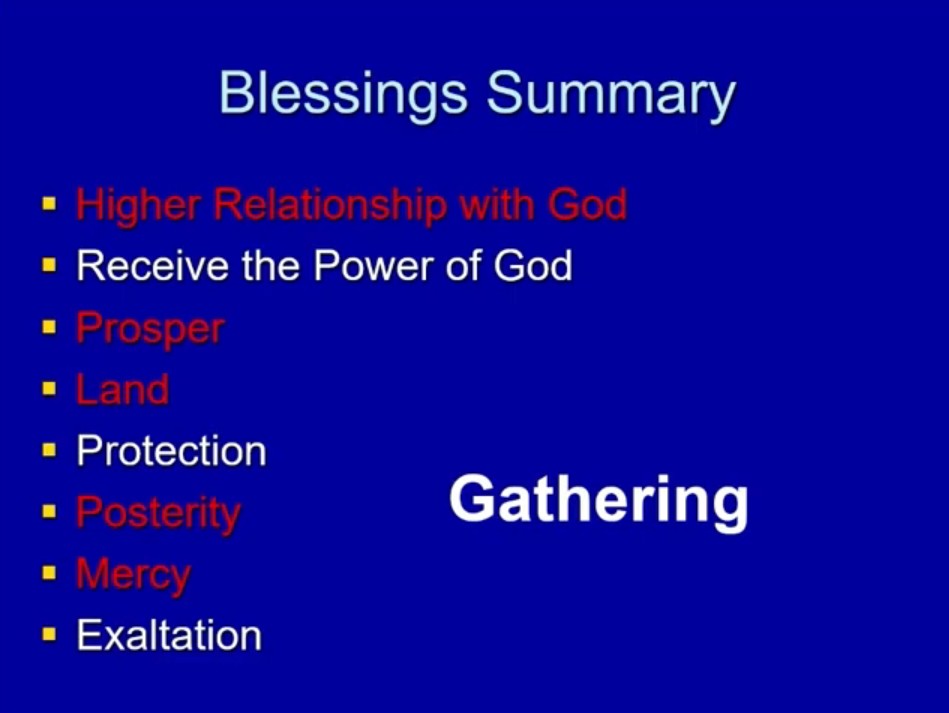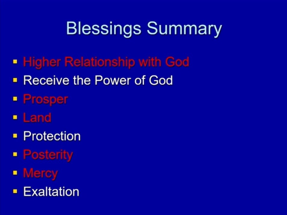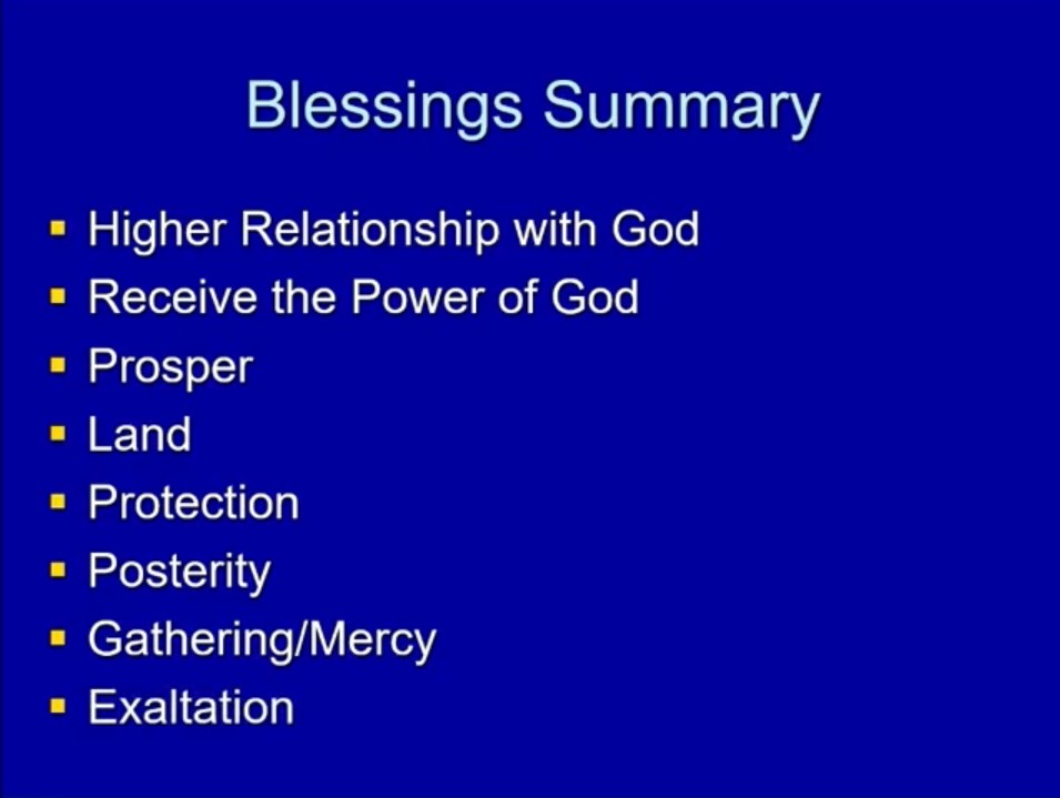 Now, let’s sum up with one last thing. We’ve looked before at the blessings promised when we keep the covenant. I want to look in particular at several of these. In some ways, you could say all of them, but several of these — having a closer relationship with God and prospering and having a place to prosper and posterity and mercy.