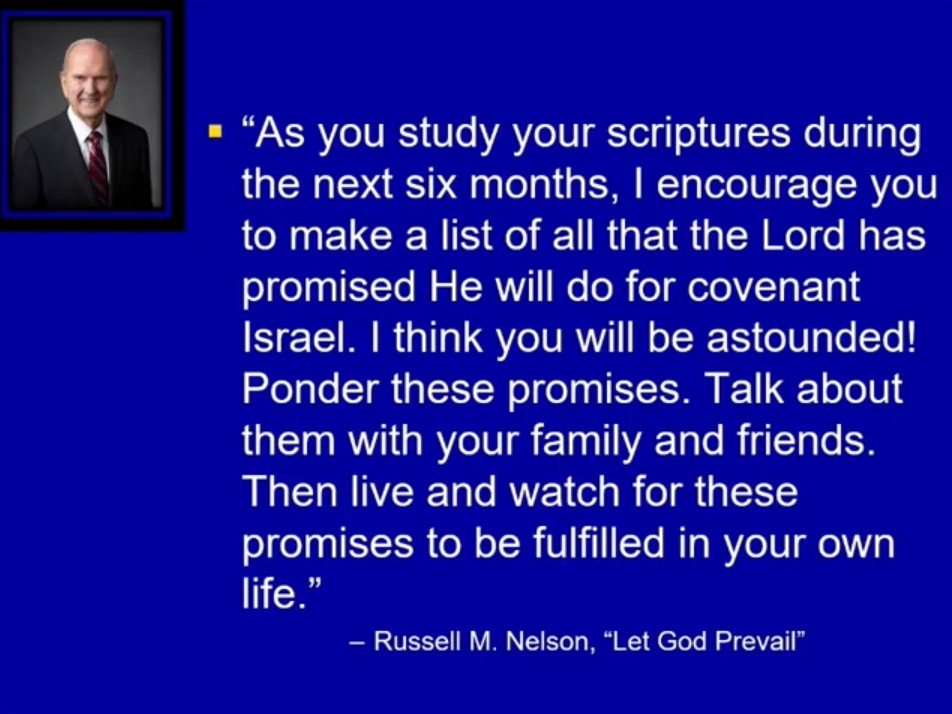 “As you study your scriptures during the next six months, I encourage you to make a list of all that the Lord has promised he will do for covenant Israel. I think you will be astounded. Ponder these promises. Talk about them with your family and friends. Then live and watch for these promises to be fulfilled in your own life.”
