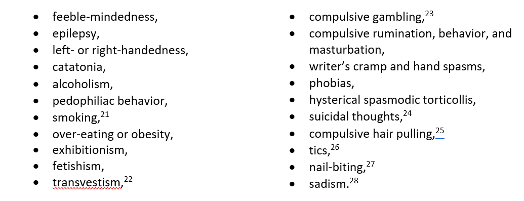 Aversion therapy is only one type of behavioral therapy. Other behavioral therapies were widely used, though we will not discuss them here. Aversion therapy specifically was used in the treatment of many behaviors, including: