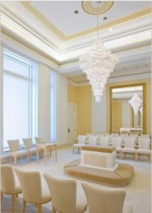Temple marriages/sealings are performed in sealing rooms. These rooms feature chairs for witnesses, friends, and family. The room has an altar in the center. The couple kneels across from each other and joins hands upon the altar. Most sealing rooms have mirrors on the walls facing the altar—this provides an effect of the couple being reflected back and forth between the two mirrors, which serves as a symbol of eternity and never-ending life.