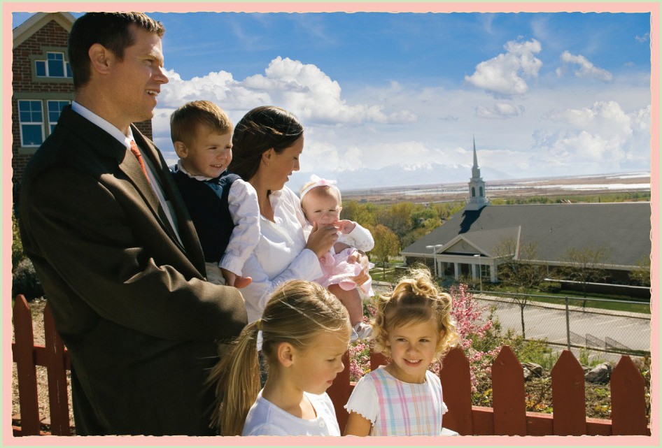 A typical Mormon chapel or meetinghouse, with a family dressed for Sunday worship.