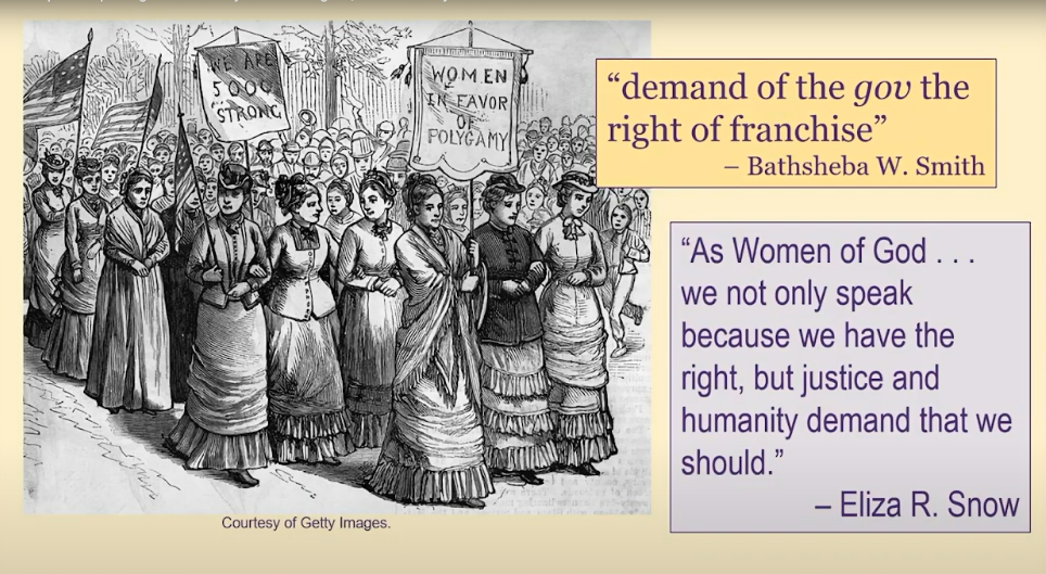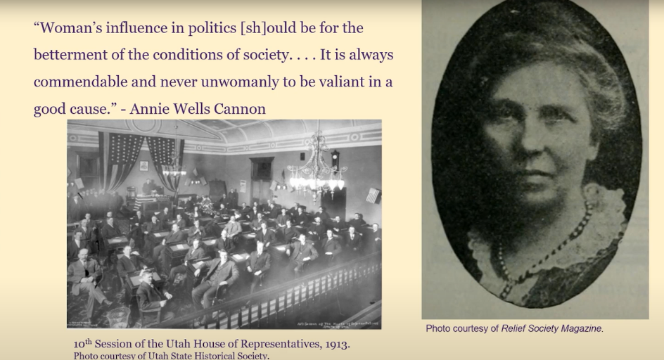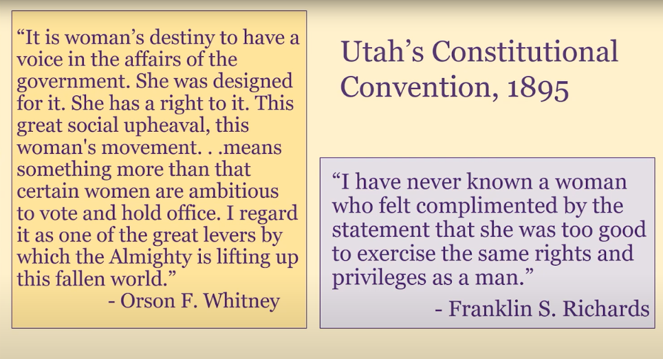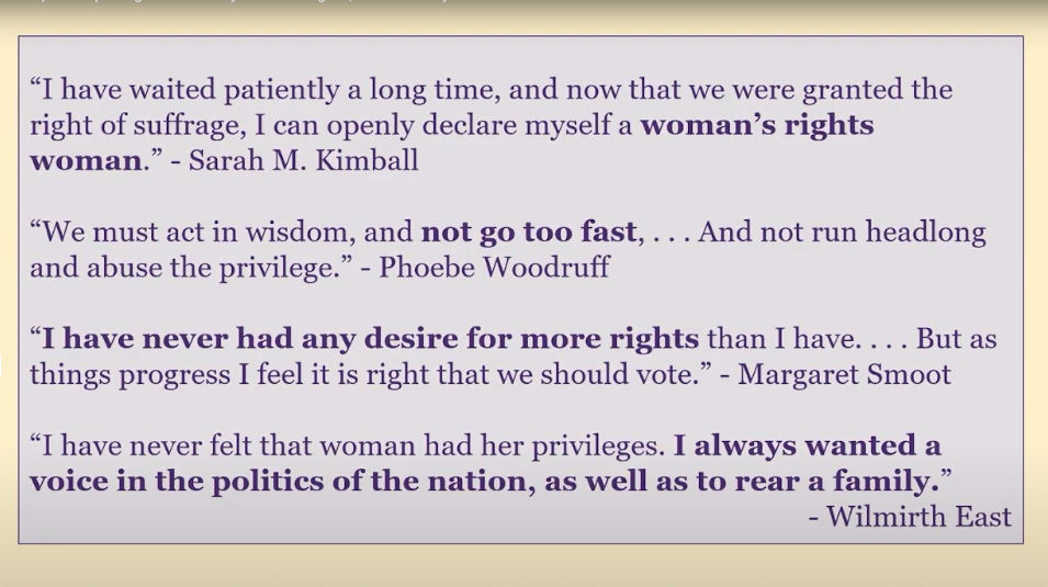 That was from Orson F. Whitney, and Franklin S. Richards cited equal suffrage as essential to the fuller measure of civil and religious liberty. Then he quipped, “I’ve never known a woman who felt complimented by the statement that she was too good to exercise the same rights and privileges as a man.”