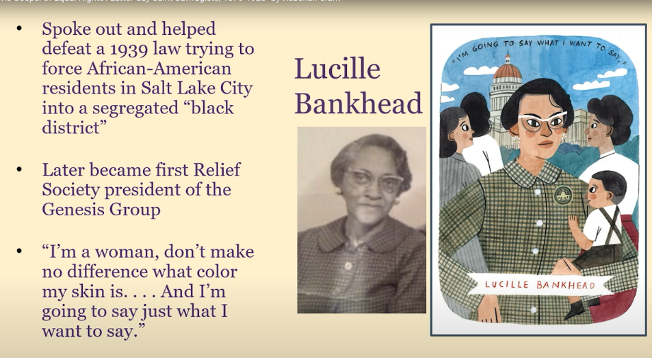 I love the story of Lucille Bankhead, a Latter-day Saint woman who later became the first Relief Society president for the Genesis Group. In 1939, she used her political voice to stand up against a proposed law that would have forced African-American residents in Salt Lake City into a segregated black district. Lucille helped defeat this bill by going up to the state capitol, which she had never been to before, and refused to leave until the legislature would listen to her arguments against the bill. Her leadership and willingness to stand up against injustice directly benefited her community and the state.