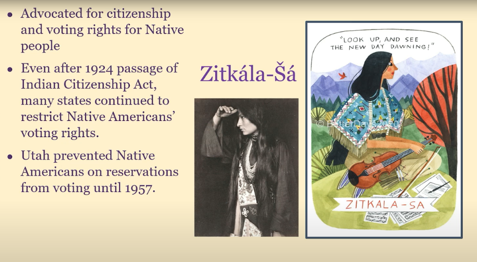 Federal restrictions on citizenship for native people and immigrants of Asian descent meant that women, as well as men in these communities, were still largely excluded from voting for many years, even decades. Utah women like Zitkala-Sa helped advocate for key federal legislation granting citizenship and accompanying voting rights for her people. Congress ultimately passed the Indian Citizenship Act in 1924, but many states, including Utah, continued to restrict native people’s access to the polls. In fact, Utah had a law on the books until 1957 that prevented Native Americans living on reservations from voting.
