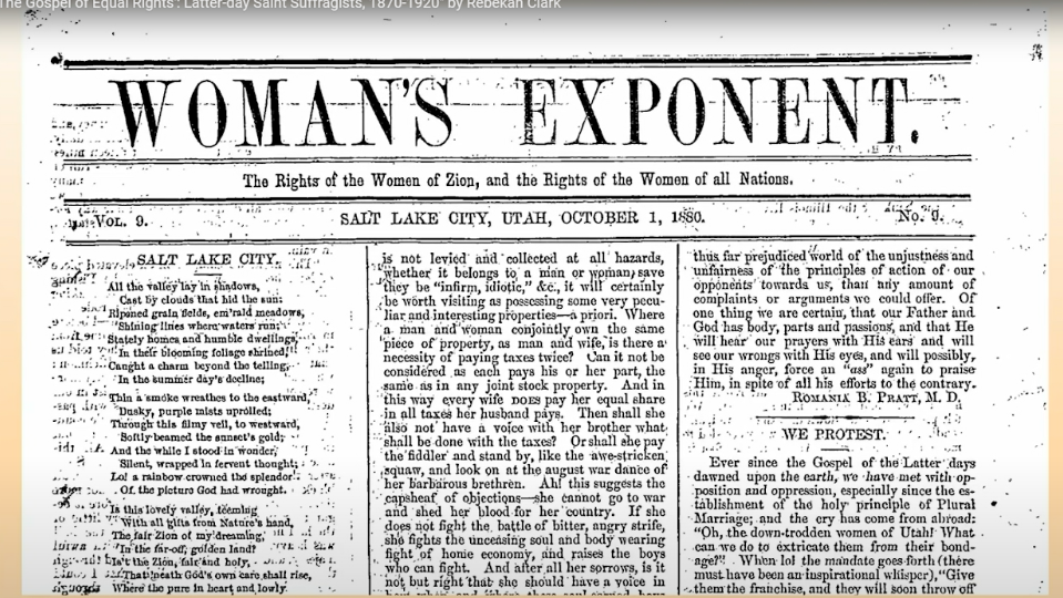 Now, in class that day, Professor Ulrich projected an image of the 19th-century Woman’s Exponent, which served as the Relief Society newspaper for 42 years and was also one of the longest-running pro-suffrage papers in the nation. She pointed to the masthead of this woman-run paper, the Rights of the Women of Zion and the Rights of the Women of All Nations. I learned that day, for the first time, that Latter-day Saint women had a long, rich, and very complex history at the very forefront of the early women’s rights movement.