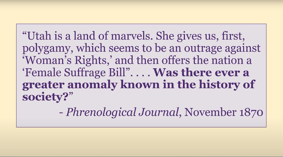 Many Americans felt just as baffled or outraged at the seeming disconnect of such a progressive stance coming from a community that practiced polygamy, which was popularly considered right along with slavery as one of the twin relics of barbarism.