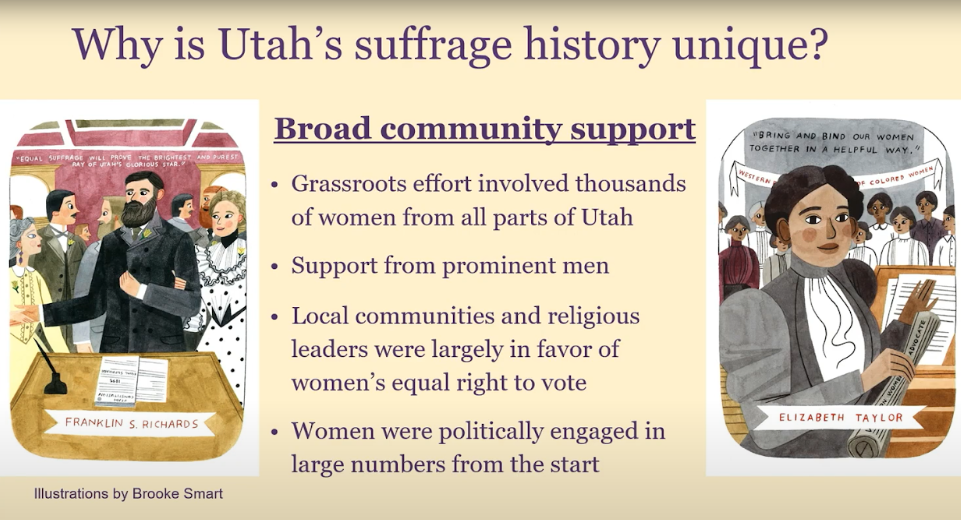 Significantly, these suffrage anniversaries also converged with the 200th anniversary of the restoration of the Church through Joseph Smith. This is actually very appropriate because Latter-day Saint suffragists, in fact, saw their advocacy for women’s voting rights as part of the restoration of the gospel. I think that’s really important.