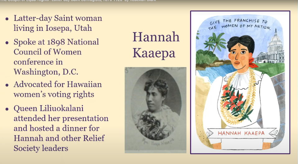 I have loved learning about each of these women, and particularly, I love the example of Hannah Kaipa. She was a native Hawaiian Latter-day Saint who came to Utah and lived in the Iosepa community after the annexation of Hawaii. In 1898, she traveled with other Latter-day Saint delegates to Washington, D.C. She spoke at the third triennial National Council of Women conference, which had a broad reach to women’s organizations throughout the nation and had an international component that also met at the time. So she had a platform that was really unparalleled, and she presented Susan B. Anthony with a lei and publicly advocated for the voting rights of her own people, of Hawaiian women.